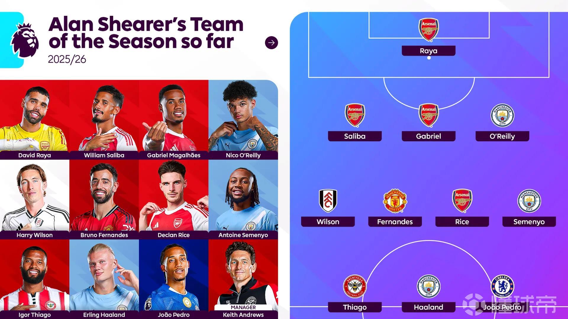 英超官方发布了阿兰-希勒评选的本赛季至今最佳阵容,阿森纳4人入选,曼城3人,布鲁诺-费尔南德斯等人在列。