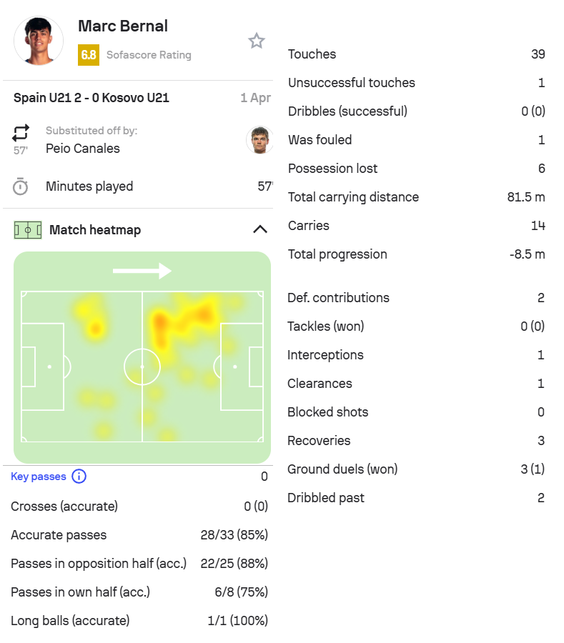 10.贝尔纳尔,西班牙U21 2-0 科索沃U21,首发出场57分钟。