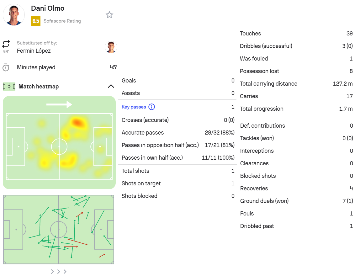 奥尔莫本场比赛首发出场45分钟,获评6.5分。