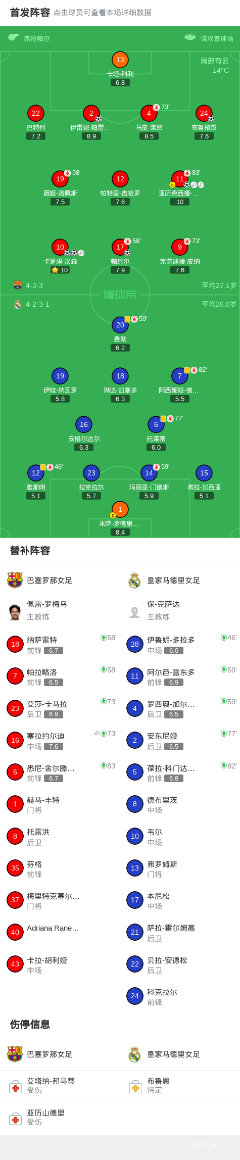 北京时间4月3日女足欧冠 1/4决赛次回合,巴塞罗那女足对阵皇家马德里女足。上半场普特利亚斯、卡罗琳-汉森、伊雷妮-帕雷德斯和帕约尔各进一球,下半场卡罗琳-汉森完成梅开二度,布鲁格茨将比分定格为6-0。最终,巴萨女足以两回合12-2的总比分击败皇马女足晋级女足欧冠半决赛。