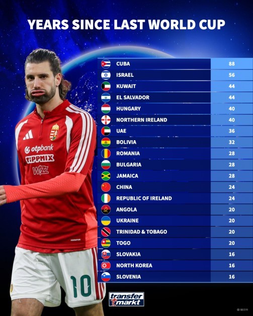 随着美加墨世界杯48强全部出炉,德转也列出了未晋级2026年世界杯、且上次参赛距今最久的国家队排名。