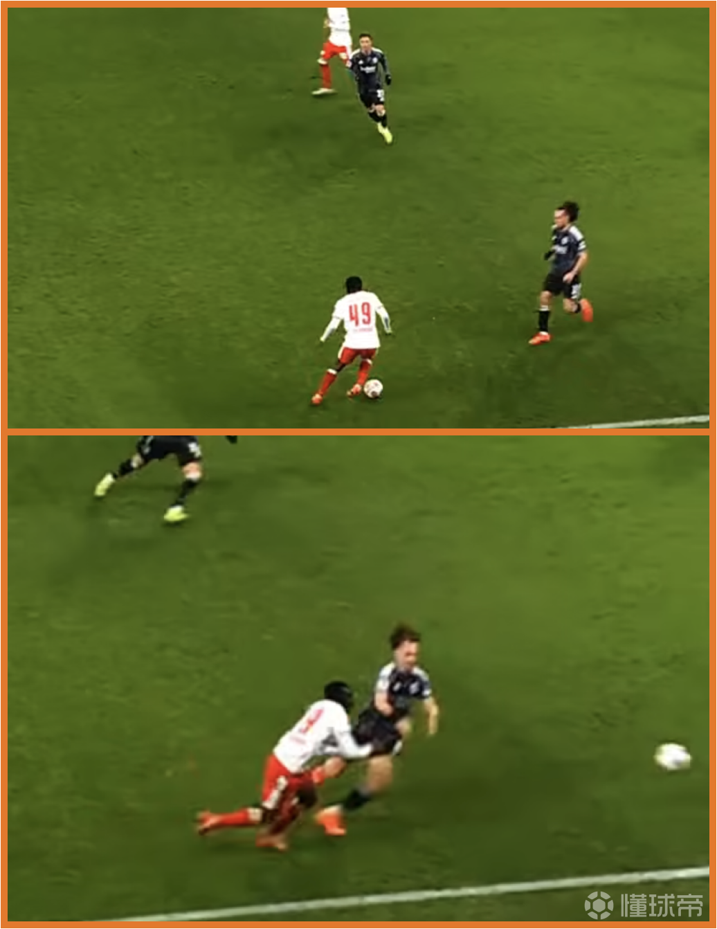 当然,这也是受限于RB Leipzig的踢法,更多是走地面层层推进,使得纵深不太有大步流星的空间(当然,即便有大步流星的空间,我看到的迪奥曼德在高速的人球结合上还是不可避免因为想更稳妥地控球,而选择降速)