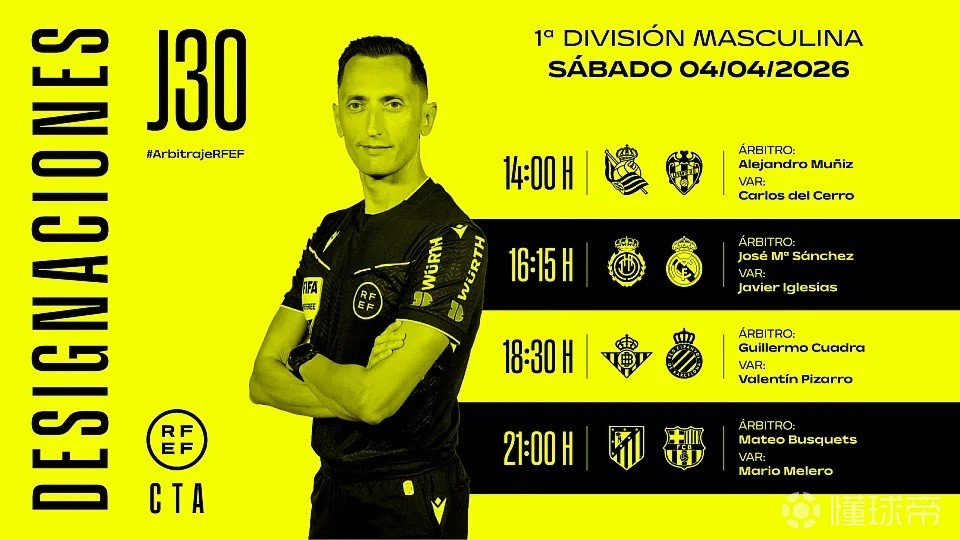 西班牙足协官方公布了周六西甲4场比赛的裁判安排,马特奥-布斯克茨将执法马德里竞技vs巴塞罗那。