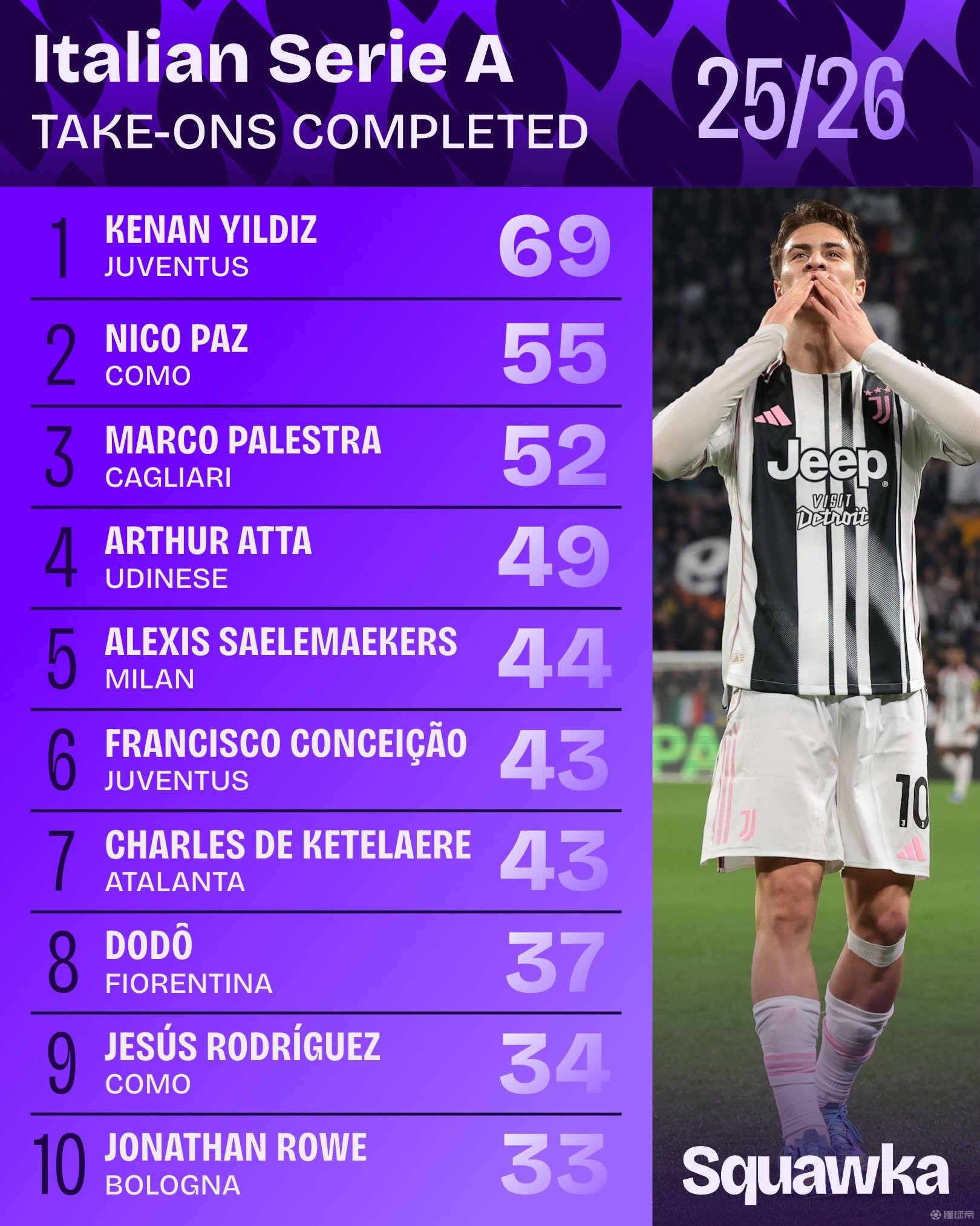 数据机构“Squawka”统计出本赛季截至目前,意甲球员成功过人次数榜,尤文边锋伊尔迪兹69次居首,科莫中场尼科-帕斯55次排第二。