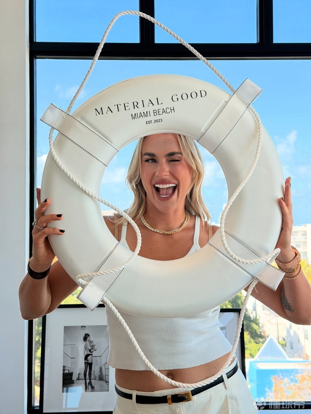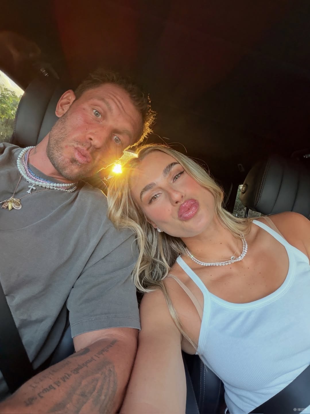 照片中,萨巴伦卡穿搭休闲简约。白色短款吊带搭配同色系阔腿西裤,脚踩乐福鞋,随性又不失精致。与未婚夫在车内同框自拍,氛围温馨甜蜜,落日余晖下二人相互依偎,尽显订婚后的幸福与愉悦。
