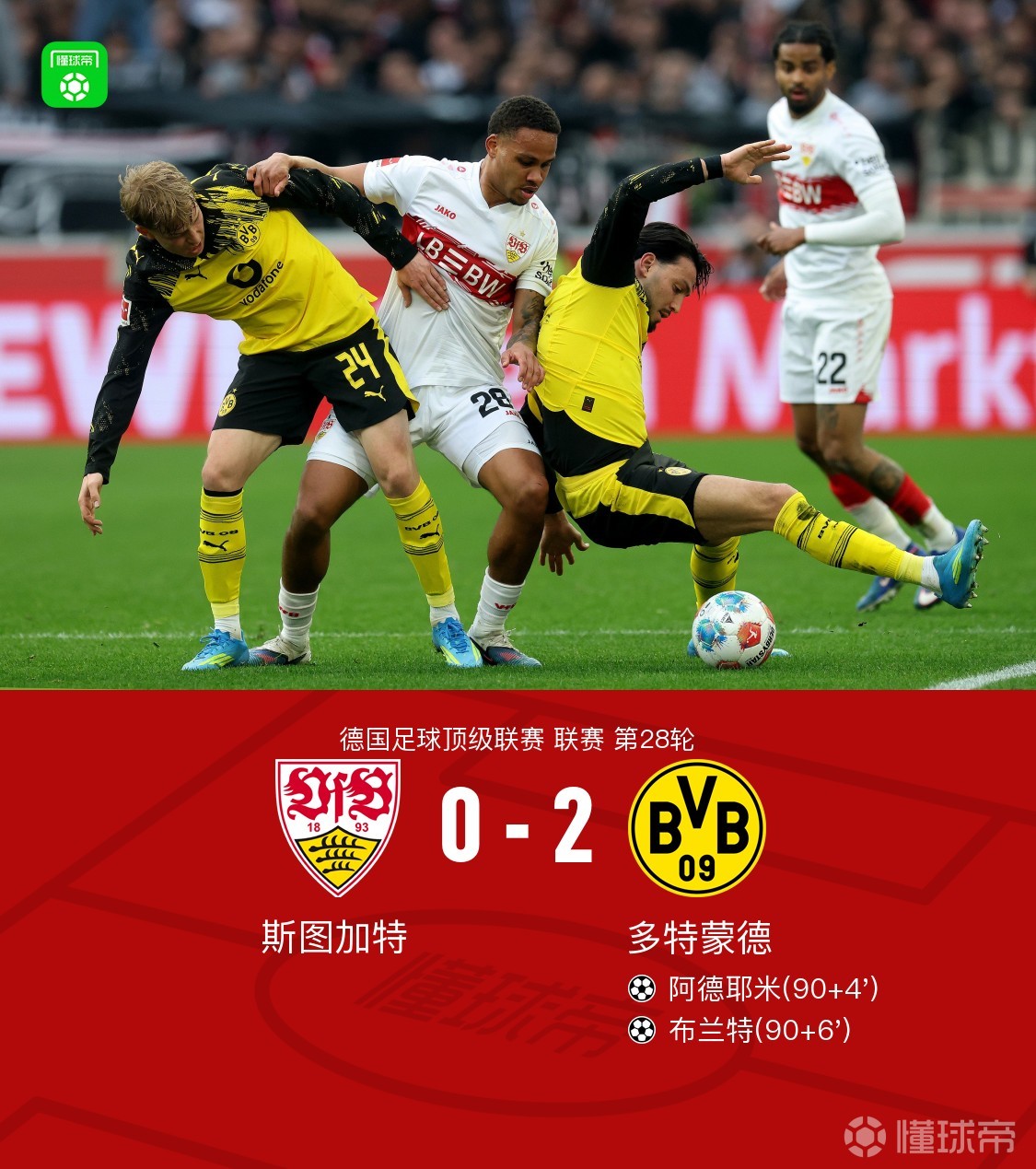 北京时间4月5日0:30,德甲第28轮继续进行,多特蒙德做客梅赛德斯-奔驰竞技场挑战斯图加特,本场主裁判为罗伯特-施罗德。比赛中,阿德耶米与布兰特补时接连破门。最终,多特2-0客胜斯图加特。