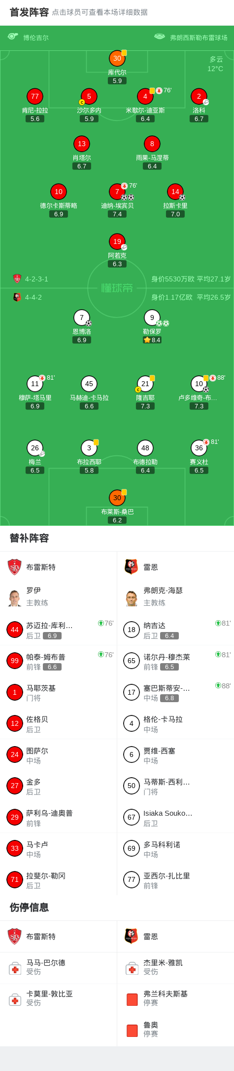 第20分钟,雷恩球员梅兰助攻卢多维奇-布拉斯打入一球。