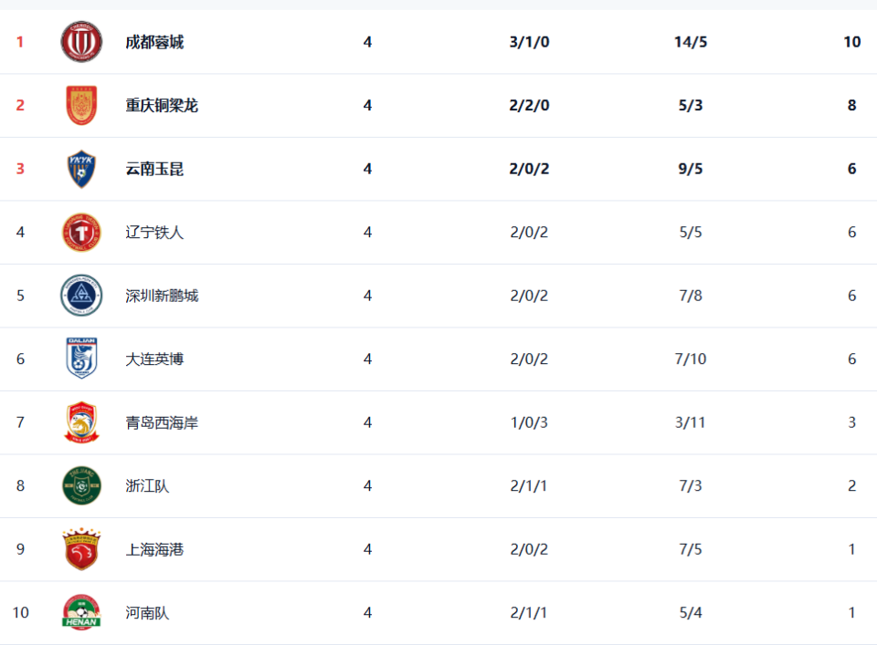 成都蓉城以10分领跑,重庆铜梁龙以8分排名第2位,云南玉昆、辽宁铁人、深圳新鹏城、大连英博同积6分。上海申花、青岛海牛同积-4分,天津津门虎则以-9分垫底。
