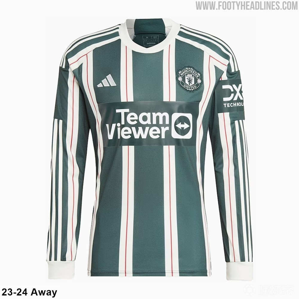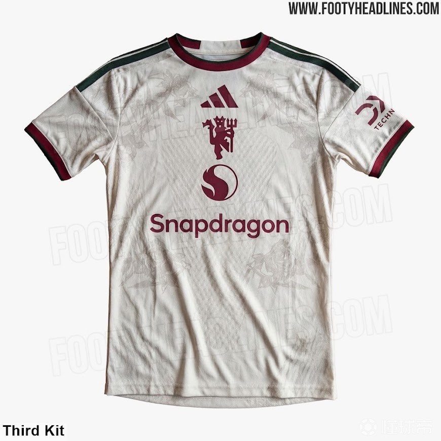 阿迪达斯为曼联设计的26-27赛季第三球衣以米白色为主色调,搭配深绿色和酒红色,虽然配色与23-24赛季客场球衣非常相似,但设计风格却截然不同。