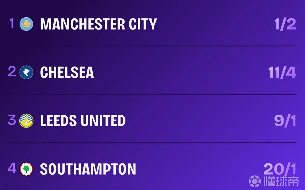 北京时间4月6日,在利兹联点球淘汰西汉姆联之后,本赛季足总杯的四强也随之确定,知名数据机构Squawka列出了四强的夺冠赔率,曼城高居第一,切尔西第二,利兹联第三,爆冷淘汰阿森纳的南安普顿排名末尾。
