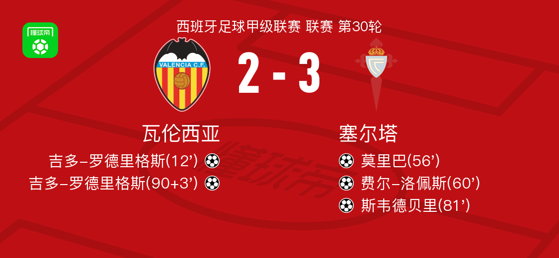 北京时间4月5日西班牙足球甲级联赛 联赛 第30轮,瓦伦西亚主场对阵塞尔塔。瓦伦西亚吉多-罗德里格斯梅开二度。塞尔塔莫里巴破门,费尔-洛佩斯破门,斯韦德贝里破门。最终比分瓦伦西亚 2-3 塞尔塔。