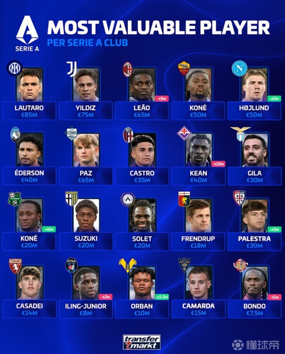 德转更新意甲20队各自身价最高球员: