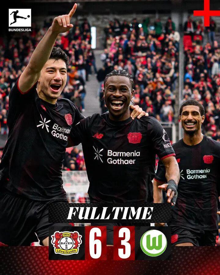 北京时间4月4日晚9点30分,勒沃库森主场迎战联赛倒数第二沃尔夫斯堡。上半场比赛,温德扛开防守队员抽射破门,帮助狼堡反客为主,随后勒沃库森得到点球机会,格里马尔多点射扳平比分,梅勒世界波为狼堡再度取得领先,埃里克森点射再下一城,格里马尔多推射完成梅开二度,半场战罢,沃尔夫斯堡3比2领先勒沃库森。下半场比赛风云突变,希克点射,塔普索巴乱战破门完成比分反超,马扎推远角得手,波库精彩过人后助攻蒂尔曼破门。最终,勒沃库森6比3大胜沃尔夫斯堡,终结各项赛事5场不胜。