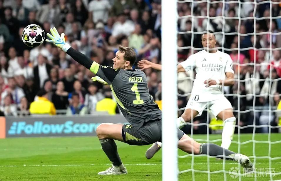 欧冠1/4决赛首回合,拜仁客场2-1战胜皇马,拜仁门将诺伊尔屡献神扑。