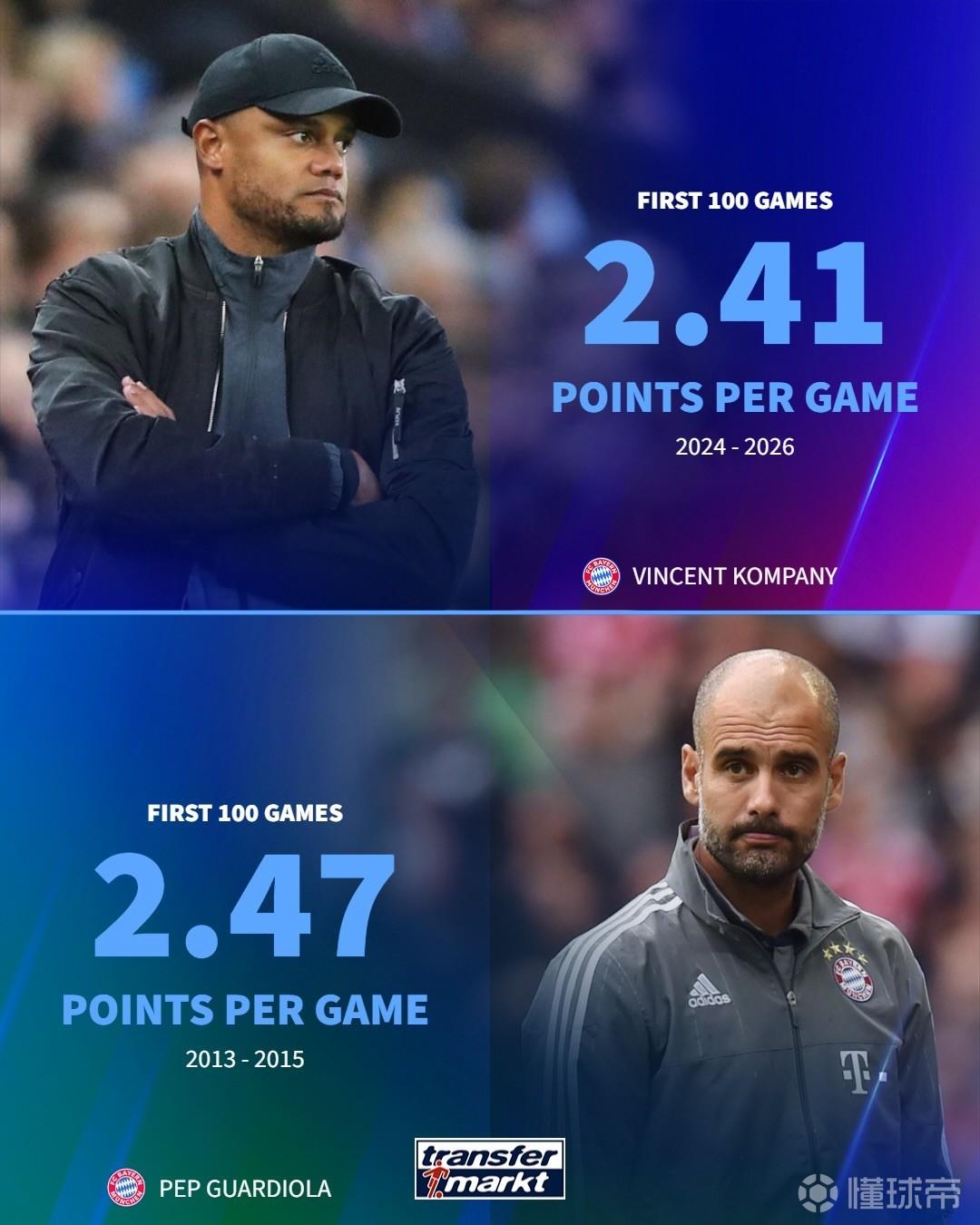 在拜仁客场2-1击败皇马后,孔帕尼带领球队100场比赛已取得76场胜利(13平11负)。根据德国转会市场的统计,孔帕尼的场均积分为2.41分,同样仅次于瓜帅(2.47分)。