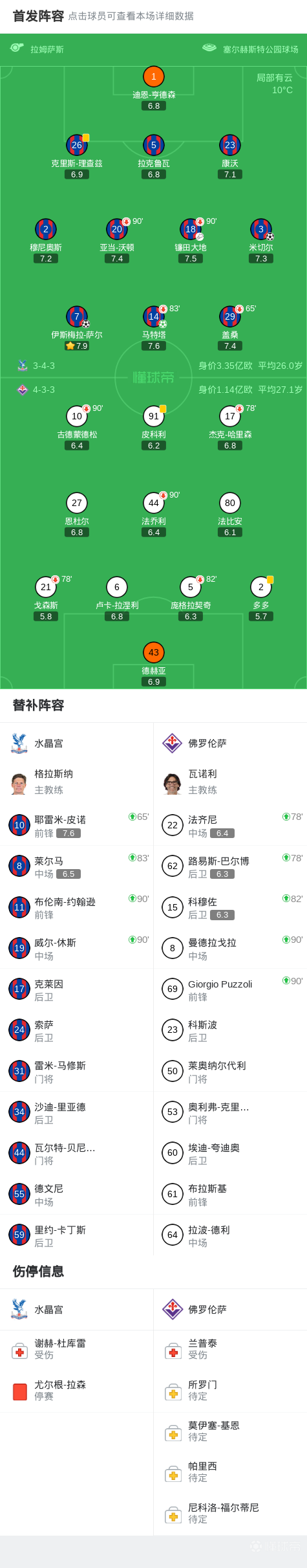 北京时间4月10日欧洲协会联赛 1/4决赛首回合,水晶宫对阵佛罗伦萨。水晶宫马特塔破门,米切尔破门,伊斯梅拉-萨尔破门。最终比分水晶宫 3-0 佛罗伦萨。