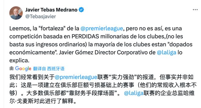 【文眼】西甲联盟主席哈维尔-特巴斯又一次对英超联赛发出警告,认为英超有可能出现高达80亿欧元的财务泡沫。他为何有底气公开“Diss”公认的第一足球职业联赛——英超?